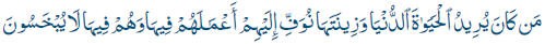 A quienes hayan deseado la vida de acá y su ornato, les remuneraremos en ella con arreglo a sus obras y no serán defraudados en ella. |