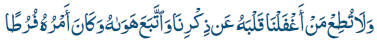 ¡No obedezcas a aquél cuyo corazón hemos hecho que se despreocupe de Nuestro recuerdo, que sigue su pasión y se conduce insolentemente! |