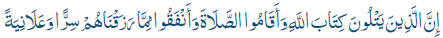 Quienes recitan la Escritura de Alá, hacen la azalá y dan limosna, en secreto o en público, de lo que les hemos proveído,