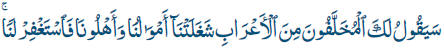 Los beduinos dejados atrás te dirán: "Nuestros bienes y familias nos han retenido. ¡Pide que nos perdone!"