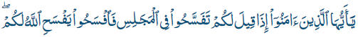 ¡Creyentes! Cuando se os dice: "¡Haced sitio en las asambleas!" hacedlo así para que Alá os haga también sitio.